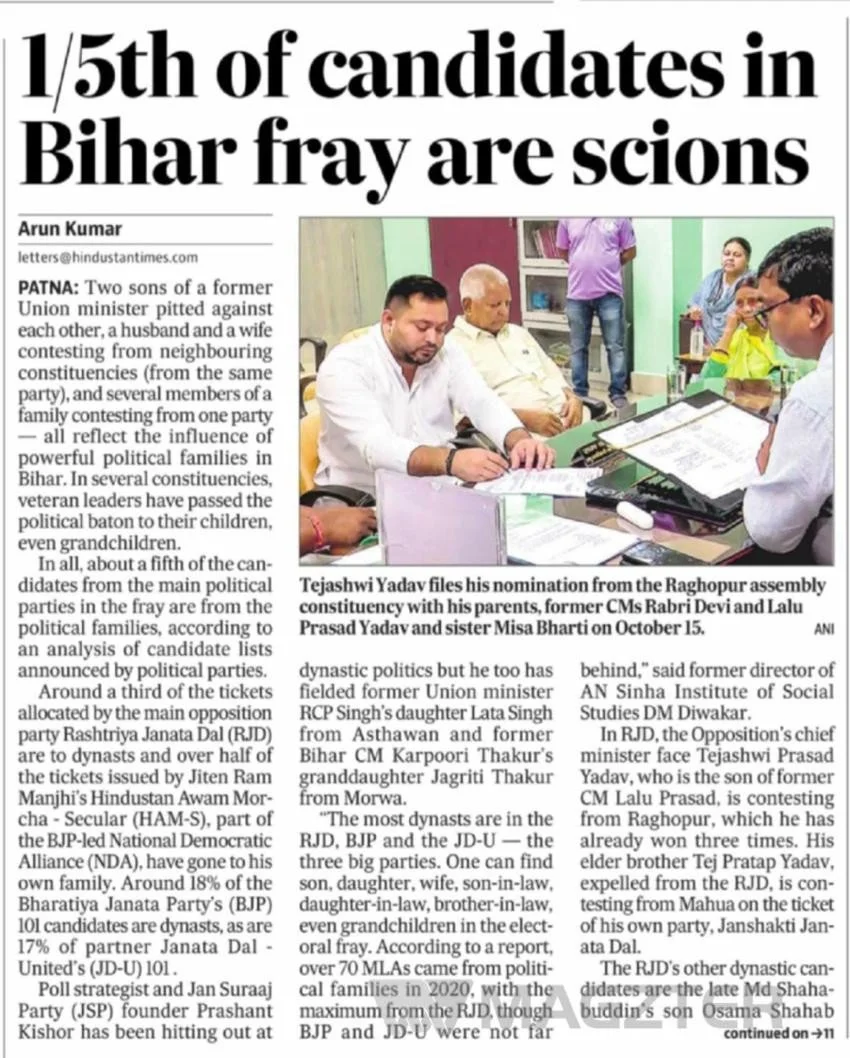 Around a third of the tickets allocated by the main opposition party Rashtriya Janata Dal (RJD) are to dynasts and over half of the tickets issued by Jiten Ram Manjhi’s Hindustan Awam Morcha - Secular (HAM-S), part of the BJP-led National Democratic Alliance (NDA), have gone to his own family. Around 18% of the Bharatiya Janata Party’s (BJP) 101 candidates are dynasts, as are 17% of partner Janata Dal United’s (JD-U) 101 .