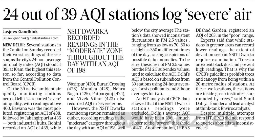 Delhi’s air quality hit the highest of the season with an AQI of 391, and 24 of 39 monitoring stations reported ‘severe’ levels. At one site in NSIT Dwarka the reading stayed much lower (AQI 198), showing odd fluctuations in PM 2.5 readings — which has raised questions over data accuracy.