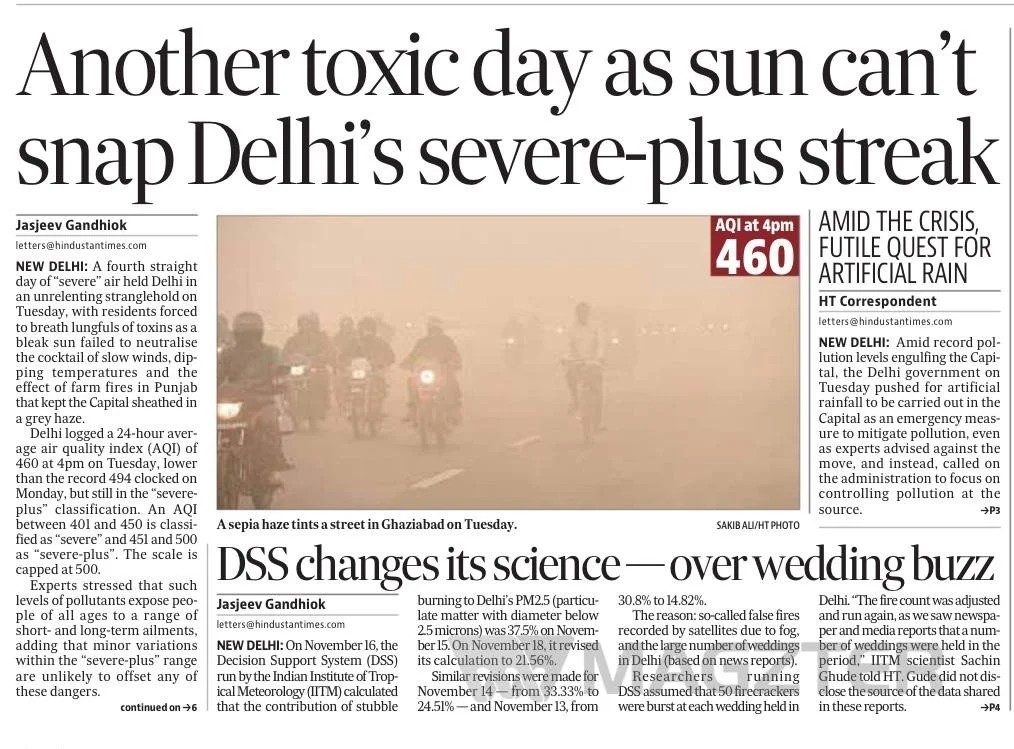 Delhi’s air stayed extremely polluted for several days, with the city recording “severe-plus” air quality (around an AQI of 460) for the fourth day in a row, despite bright sunshine that morning. The smog was caused by slow winds, cooler temperatures and smoke from nearby farm fires, trapping pollutants close to the ground and making the air dangerously toxic for residents. Experts warned that such high pollution levels pose serious health risks and that weather conditions offered little immediate relief.
