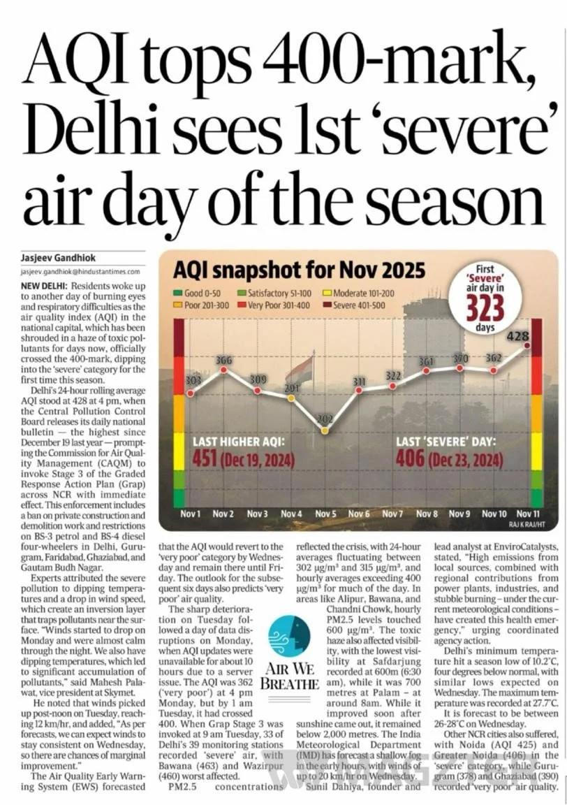 The Air Quality Index (AQI) has gone above 400, which is the level at which air is considered severely unhealthy. This is due to a combination of factors, including calm winds that are failing to disperse the pollutants and an increase in pollution from farm fires in nearby states.
