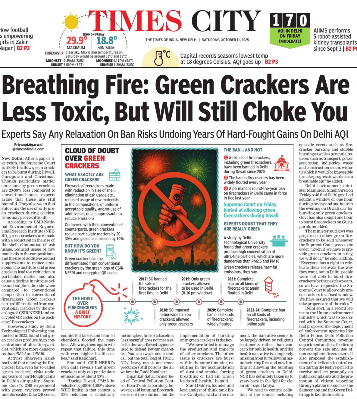 Breathing fire: Green crackers are less toxic, but will still choke you Times of India Oct 11 Written By Zainab Ashraf Green CrackersDiwali 2025Delhi Air QualitySupreme Court on Green Crackers Zainab Ashraf