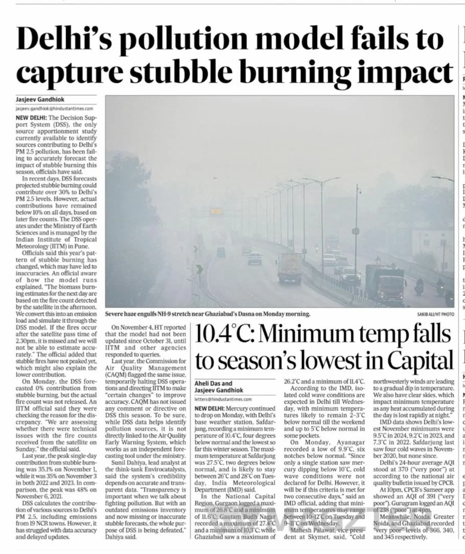 The report says that Delhi’s pollution tracking model, called the Decision Support System (DSS), has not been able to correctly measure how much stubble burning contributes to the city’s poor air quality. Officials said the model often shows lower figures than the real impact because it struggles to use satellite data and changing burning patterns accurately. Experts believe this gap affects how pollution control plans are made. The article also mentions that Delhi’s air quality remained severe, and officials are working to improve the system for more reliable data.