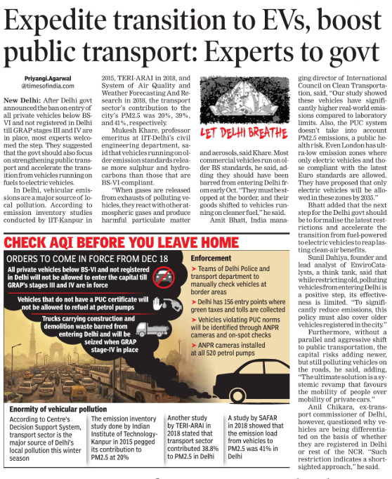 Either read from the newspaper clipping attached below or click on the link to read this article: Expedite transition to EVs, boost public transport: Experts to govt