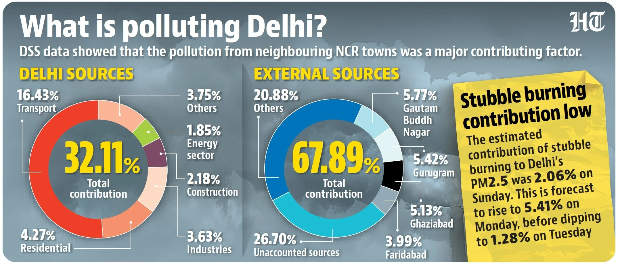 Data on Sunday showed that at least 67.89% of Delhi’s total PM2.5 contribution was from external sources.