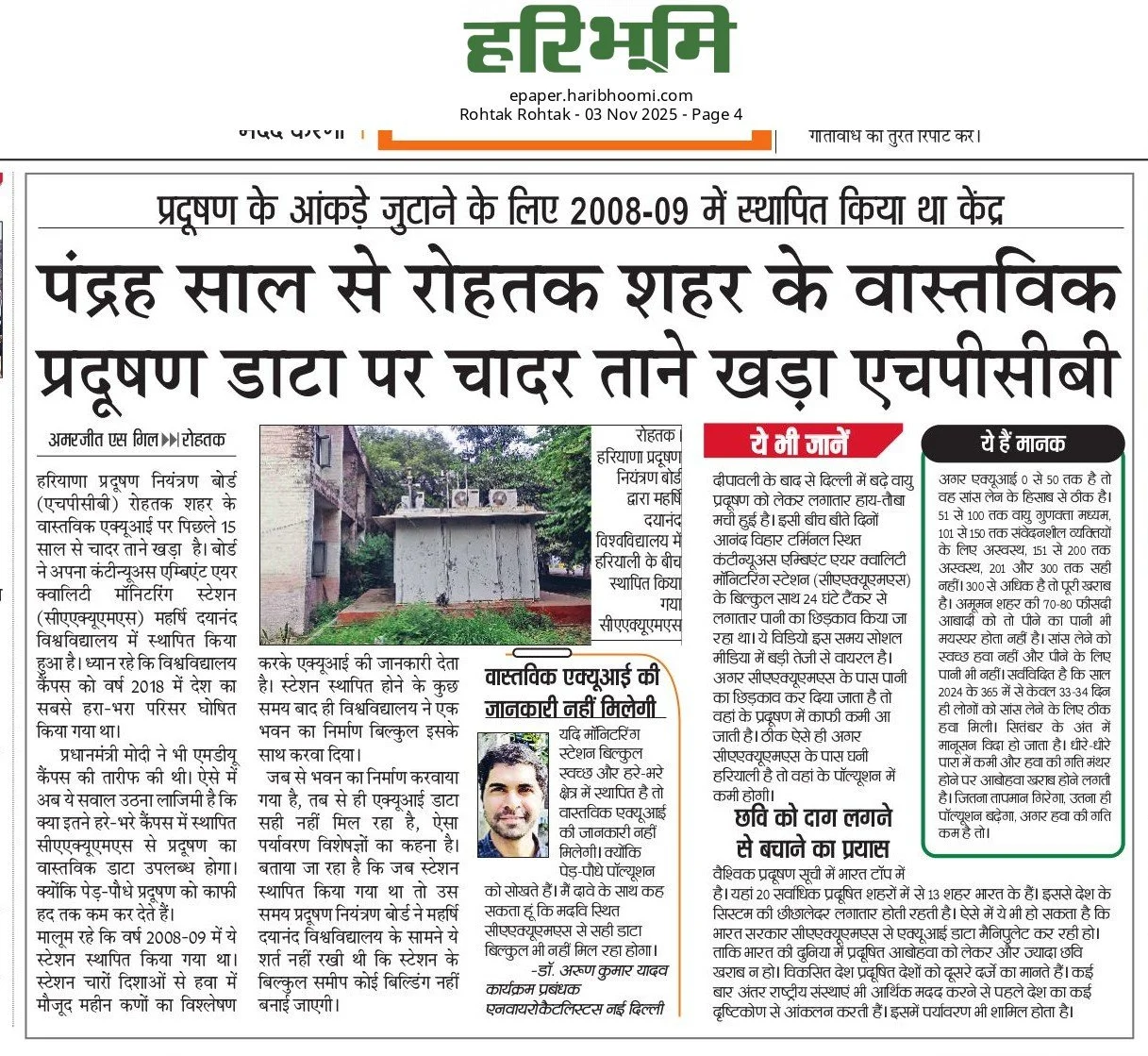 पंद्रह साल से रोहतक शहर के वास्तविक प्रदूषण डाटा पर चादर ताने खड़ा एचपीसीबी Harbhumi Nov 3 Written By Zainab Ashraf Read the coverage here: RohtakAir Pollution Zainab Ashraf