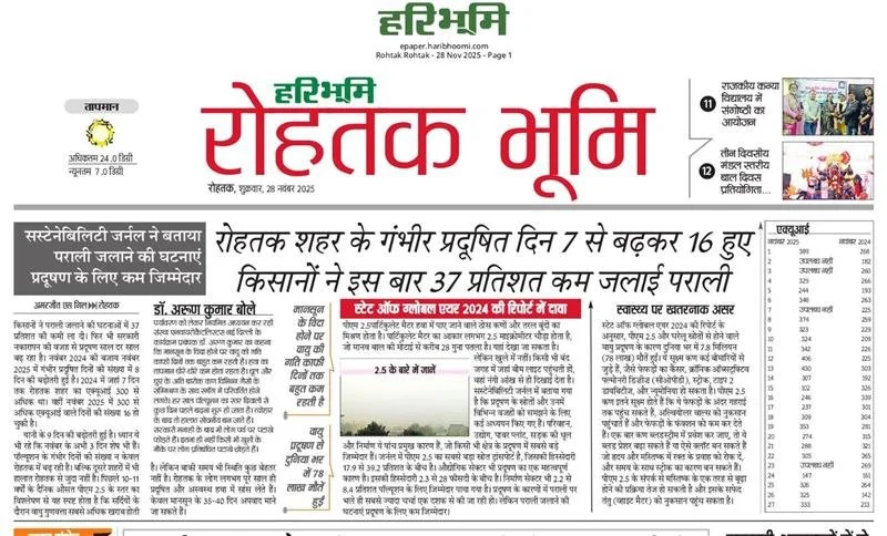 A new report shows that Rohatak recorded 16 days of severe air pollution this year, more than double last year’s count of 7. At the same time, stubble burning reduced significantly, with farmers burning 37 per cent less crop residue. This suggests that factors other than farm fires — such as vehicle emissions, construction dust and weather — are contributing to worsening air quality. Officials say continued efforts and stronger measures are needed to control pollution.