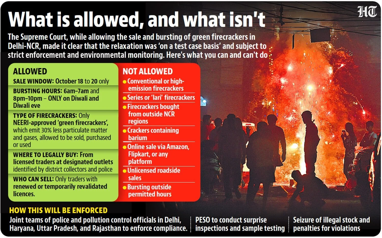 Delhi-NCR is set to have a cracker of a Diwali this year — quite literally. The Supreme Court on Wednesday permitted the sale and bursting of green firecrackers in Delhi-NCR between October 18 and 20 — it had indicated it would do so on Friday, but issued the order and also explained the nuances on Wednesday — calling the decision a “balanced approach” aimed at reconciling the right to livelihood and the right to clean air.