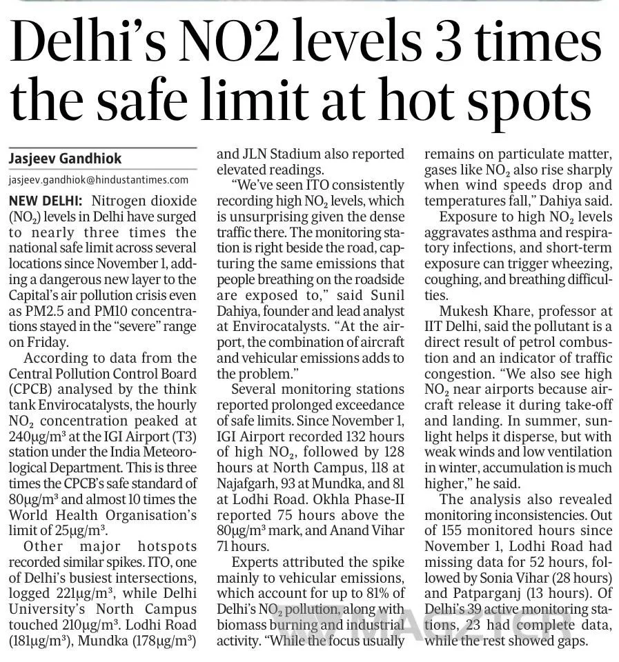 Delhi’s NO2 levels 3 times the safe limit at hot spots