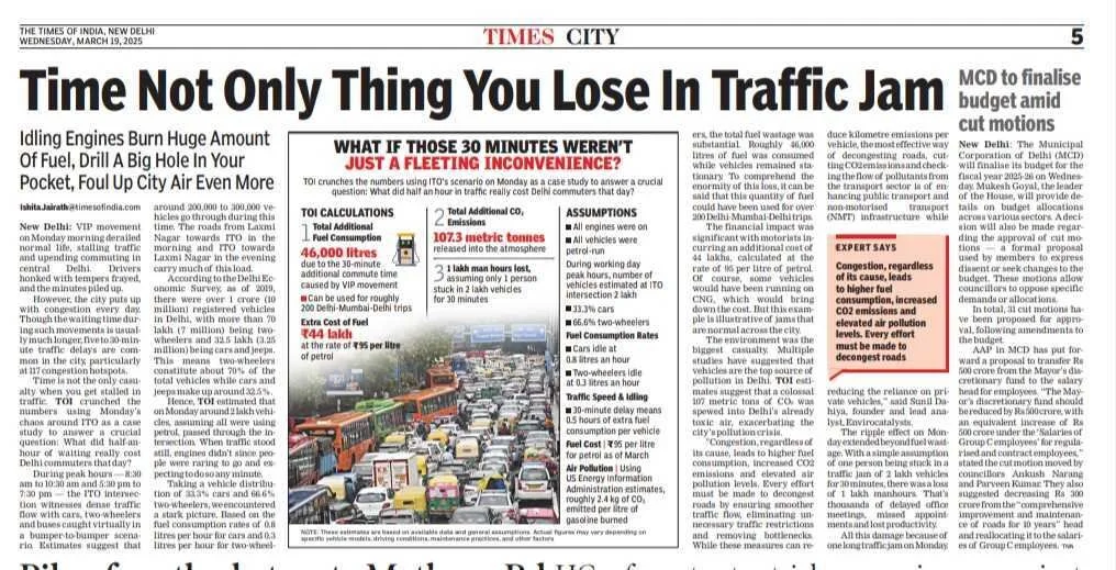 Traffic jams cost more than time: Delhi loses lakhs in fuel, productivity Times of India Mar 19 Written By Sunil Dahiya Air PollutionDelhi Sunil Dahiya