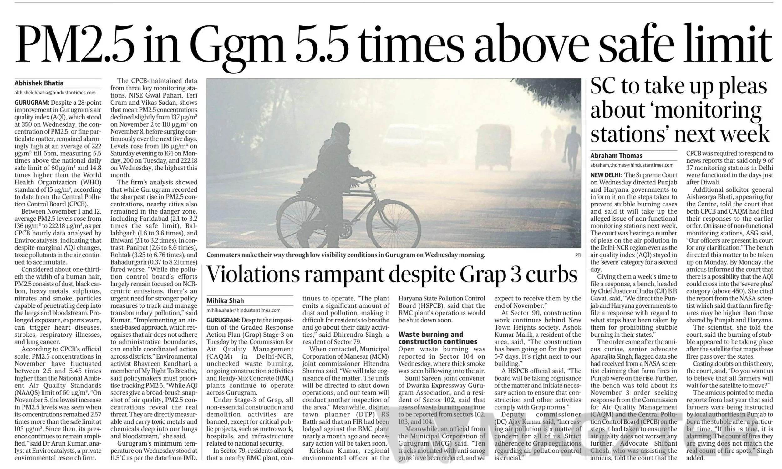 Gurugram’s PM2.5 levels 5.5 times above safe limit despite slight AQI improvement
